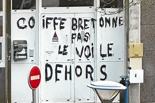Ce sont les « services techniques de la ville qui ont découvert les inscriptions », a dit à l’AFP une source policière. « +Coiffe bretonne pas le voile, dehors+ », était-il écrit, avec une « inscription complémentaire qui ressemble à une signature +VAK+ ou +VIK+ », a ajouté cette source.